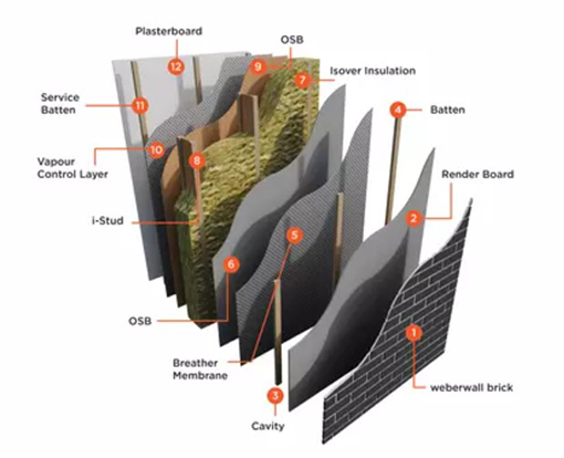 The core of the panel is an engineered stud, used for its ability to reduce thermal bridging through the panel. The panel uses mineral wool insulation between the stud, which is hand fitted to reduce voids and slumping. The panel is supplied with membranes, service zones and externally fitted battens. When combined with other systems, PMV values of 62% can be achieved.