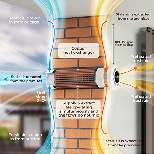 DMVHR helps maintain good indoor air quality by removing pollutants, excess moisture, and odours – great for eliminating damp and mould. It reduces heating costs by recovering and reusing heat that would otherwise be lost. It provides room-level control, allowing occupants to adjust ventilation rates according to their needs. Additionally, it avoids the need for ductwork, making installation easier and more flexible.