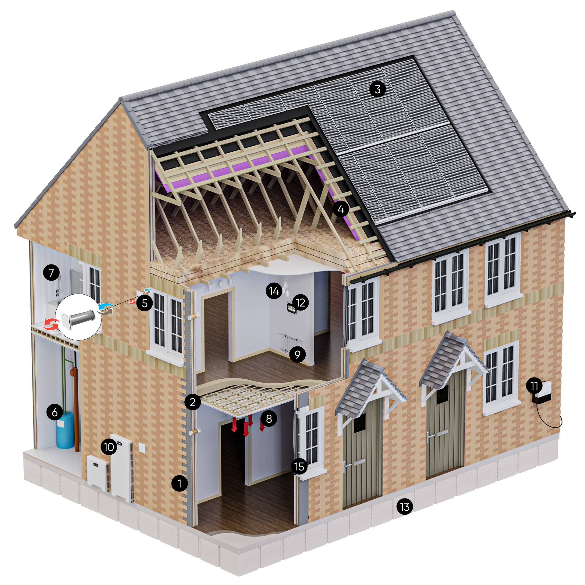 We use a Decentralised MVHR System “”DMVHR””. Unlike traditional whole house ventilation system or centralised MVHR systems with ducktwork, our decentralised MVHR ensures that a constant stream of fresh air is supplied to each room individually. This decentralised approach allows for precise control over air quality and temperature, creating a healthier and more comfortable living environment while insuring that no energy is wasted in unoccupied rooms. It also means that there is far less maintenance than centralised MVHR.