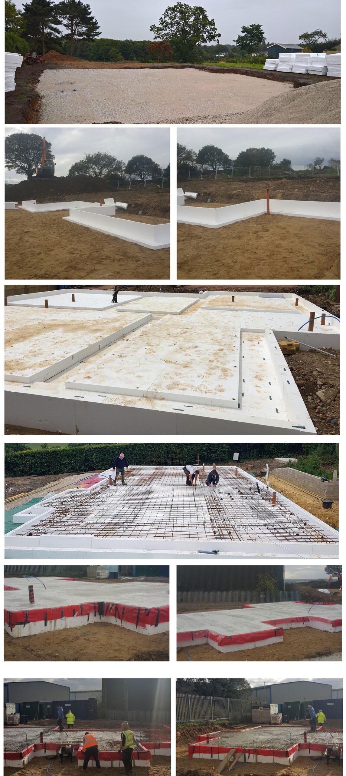 Coupled with the fact we don’t use bricks, our buildings are much lighter and we can therefore use innovative foundations. The product arrives on site as a fully engineered ready-made formwork that fits together to create a fully insulated concrete structural foundation. This outline then remains in the ground and concrete poured in one operation to create an eco-efficient slab foundation.